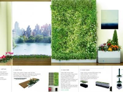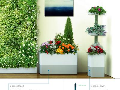 设计师利用5个模块化产品,营造了一个数字化绿色家庭环境,其中包括两盆绿色的塔状盆栽、一面绿色的墙、一个花坛和一个数字绿色走廊。这些产品全部都由智能化植物培育系统进行控制,能给予植物充足养分,让其茁壮成长,你无需费力养护。