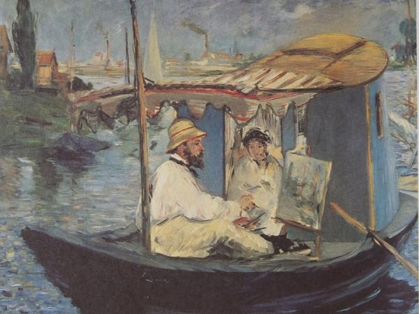 再次,在莫奈生活的年代,罐装的油画颜料已经面世,这使画家的户外写生成为可能。莫奈是西方画家中走进大自然的第一批人。为了写生,莫奈还购置了一条小船,载着他随波逐流,见到美丽的景致便随时停下来挥毫涂彩。同时代的大画家马奈曾用画笔记录莫奈的写生情景,看,他的神情是那么的专注!