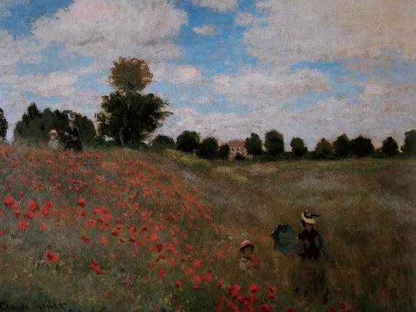 莫奈的名画《野罂粟花》,画的是一个夏天的上午(罂粟花在夏天盛开),阳光明媚,绿草成茵,几位女士款款走来,一派惬意的田园风光。由于女士们戴着白色带彩色条子的帽子,与周围的色彩产生强烈的反差,所以观者能一眼看清楚她们的位置(大细胞作用)。但是,在画面左侧,满眼都是绿色和嫩绿色的叶子,密密地点缀着嫣红的罂粟花,有袅娜地开着的,也有含苞欲放的。由于绿叶、红花的色彩亮度处于平衡状态,故大细胞不作为,所以花朵的位置显得模糊不清。倘若观者定神端详一会儿,还会觉得好像有一阵微风吹过,花朵有了一丝颤动。这是因为观者的眼球在不断地运动,视网膜上的映像不断移动产生的效果。