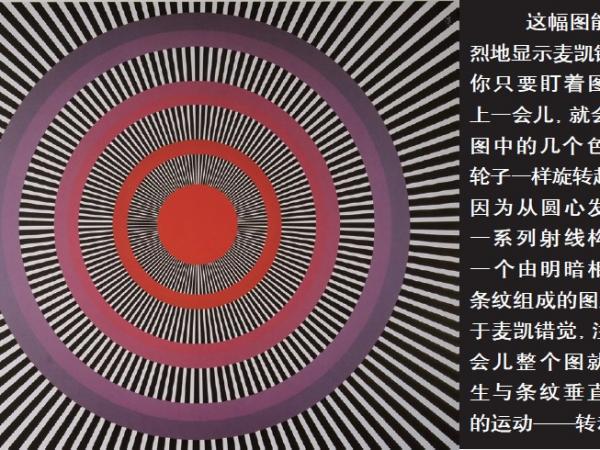 在《红与绿图案》中,由于图中红、绿两种颜色的亮度处于色彩平衡状态,所以我们很难看清楚图案的花样和位置。这是为什么呢?原来,人的视觉系统有点像立体声音响,是通过两条平行通道来传递视觉信息的:一条是小细胞系统,主要把色彩信息通过视神经传送到大脑视皮层;另一条是大细胞系统,主要把空间位置、形状、运动等信息通过视神经传送到大脑视觉皮层,然后再分别传送到大脑的相关部位。大脑把这两方面的信息有机地融合起来,产生了完整的视知觉。如果前一条视觉通道出了故障,人就成了色盲;如果后者出了问题,情况更糟糕,看出去的世界都是静止的,连穿马路都会有困难。在《红与绿图案》中,由于色彩斑斓,激发了小细胞的兴奋,所以我们能够感知图案的色彩。但是,大细胞对颜色不敏感,亮度相等的两种颜色对它来说就是均匀一片,所以我们难以判断图案的位置、形状,并觉得图像有点飘忽不定。