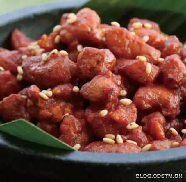 4. 平锅中倒入炸鸡料,沸腾后倒入已经炸好的鸡块,裹上一层炸鸡料,最后撒上一点松子。