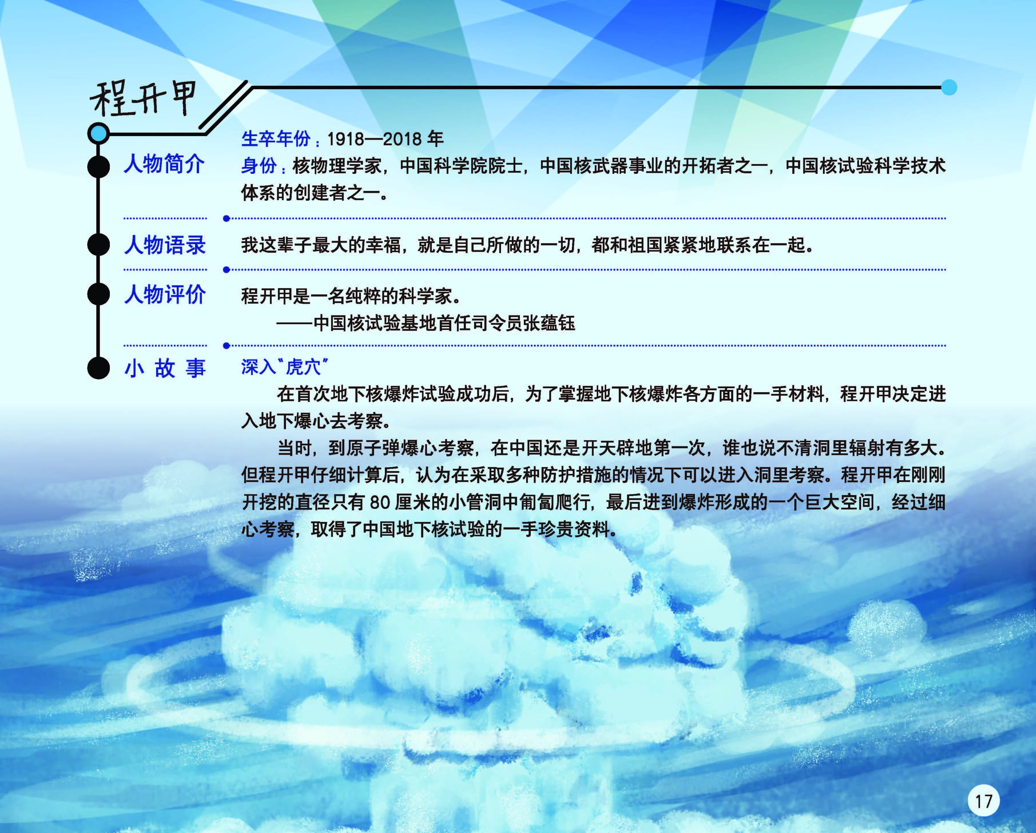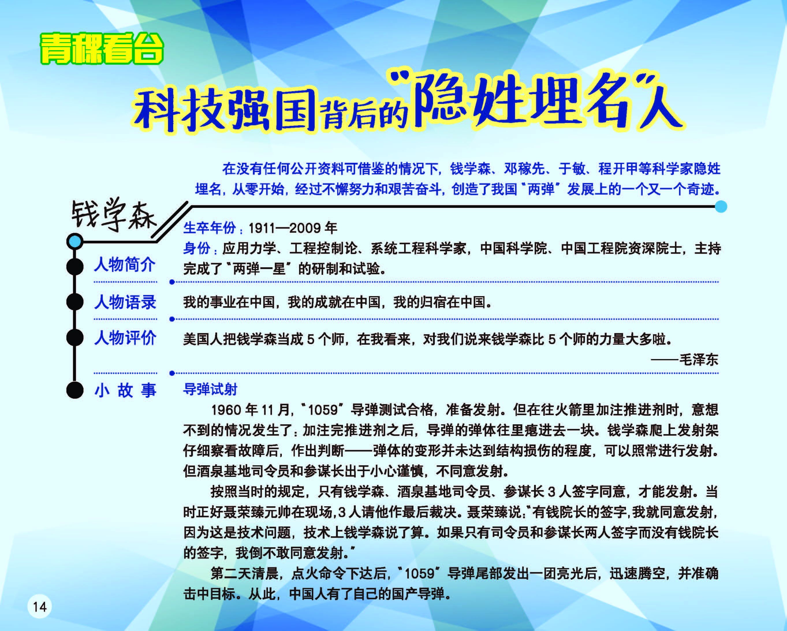 在没有任何公开资料可借鉴的情况下,钱学森、邓稼先、于敏、程开甲等科学家隐姓埋名,从零开始,经过不懈努力和艰苦奋斗,创造了我国“两弹”发展上的一个又一个奇迹。