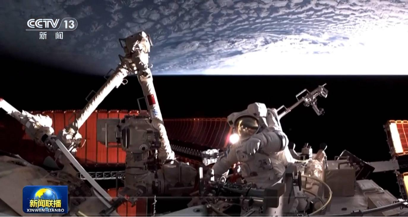 同年11月7日,神舟十三号航天员翟志刚、王亚平完成中国首次女航天员出舱。两次累计13小时的舱外作业中,他们搭建了机械臂悬挂装置与转接件组合体,抬升全景相机扩展观测视野,完成舱外工具箱等设备的多点位固定。