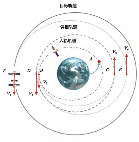 快速交会对接设计有5~8小时多种方案,具体时长与火箭入轨精度以及两飞行器间的相位差有关。远距离导引段有4~6次变轨脉冲,上图所示为5个变轨脉冲(A为入轨点,B点到F点为脉冲点)的追逐过程。