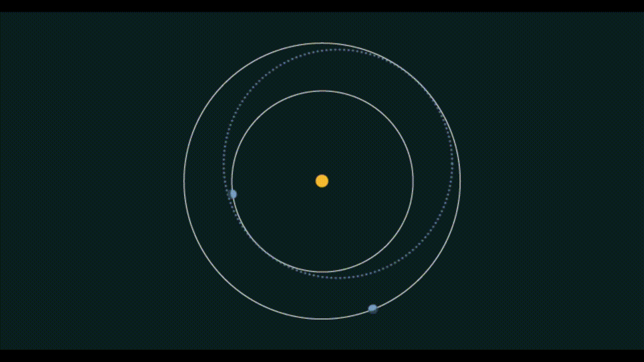 交会对接特指两个航天器在空间轨道上会合并连接成一个整体的技术。类似于我们在地面将两块积木插在一起,但是要在太空中完成这个动作可不容易,因为航天器在太空中的飞行轨迹遵循“天文动力学”,即,航天器在轨道上的运行符合天体运行规律,要到达不同轨道上的另一个位置必须通过发动机喷气改变航天器的运动速度大小或方向,从而变换轨道来实现。以抬升轨道高度为例,并不是我们直觉认为的通过向下喷气实现向上的直线运动;最经济有效的方法是通过两次喷气控制航天器加速,即“霍曼转移”来实现,如下图所示。