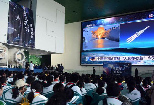 中国科技馆举办“奇迹天宫,荣耀见证”主题活动,观看发射现场直播。