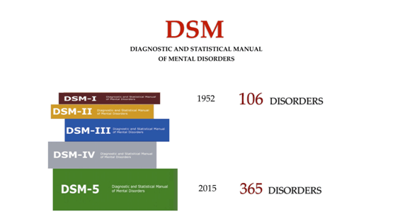 美国《精神疾病诊断与统计手册》(DSM)的第一版在1952年发表,随后经历过1968年、1980年、1994年的四次重大改版,2013年出版了最新的第五次改版。每一个版本都反应的是当时主流的精神病学理论,比如第一版和第二版主要受到精神分析理论的影响,更可以看成一本探讨精神病症状产生原因的“理论书”,和现在的精神疾病划分已经大不相同。从第三版起,DSM改用了医学模式的诊断方式,这也使得“病”与“非病”之间有了明确的区分,成为了一本指导临床诊断、区分疾病的工具书。DSM涵盖的精神疾病越来越多,划分也越来越细,在2013年出版的最新版DSM-5中,包括365种精神疾病,其中大部分甚至不存在于1952年出版的DSM-I,而DSM-I中的很多疾病也被新的标准和名称取代。