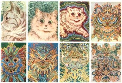 图注:英国画家Louis Wain从正常到精神分裂期间画的各种猫