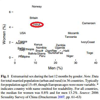 (纵坐标是过去一年女性出轨比例、横轴是男性出轨比例;注意坐标轴的比例尺有所区别)