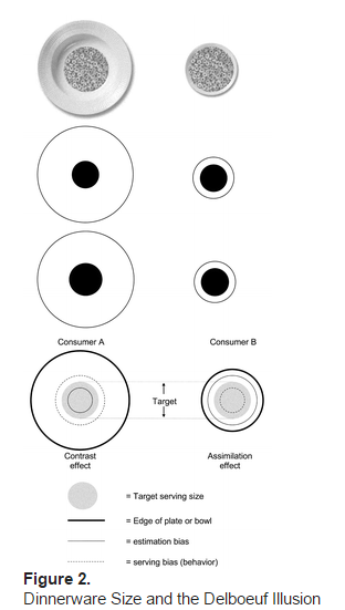不仅是食物本身的量大量小会影响人们的胃口,就连装食物的容器大小也会影响我们对于“是否饱了”的判断。有学者认为Delboeuf错觉会影响人们的进食,因为装在大盘子里的菜看起来更少。结果的确如此:大盘子不仅吃的多,而且也给的也多。还有实验者发现,即使是自助餐,让儿童分别使用成人的盘子(比较大)或者儿童餐具吃饭,结果用大盘子的孩子吃的也比较多。