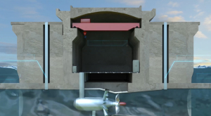 把靠海的河口或海湾同大海隔开,在大坝中安装上水轮发电机组,涨潮时先关闭闸门,达到可以发电的水位差后,打开闸门,海水从大海通过缺口流进水库,冲击水轮机旋转,水位持平后关闭闸门,在落潮时达到可以发电的水位差后,海水又从水库通过缺口流入大海,则又可从相反的方向带动发电机组发电。