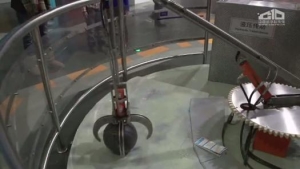 这件展品的特点是运用了液压传动系统,通过两个操纵杆以及一个方向控制盘来对机械手臂进行操控,实现对篮球的抓、放、移动等操作。