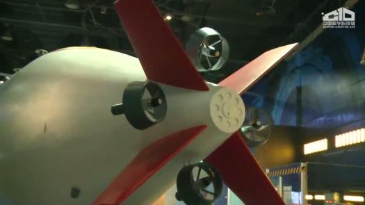 这件展品是中国自主研发的“蛟龙号”深海载人潜水器的等比例尺寸模型。体验者可以通过展品中间的步行梯进入内部观看。