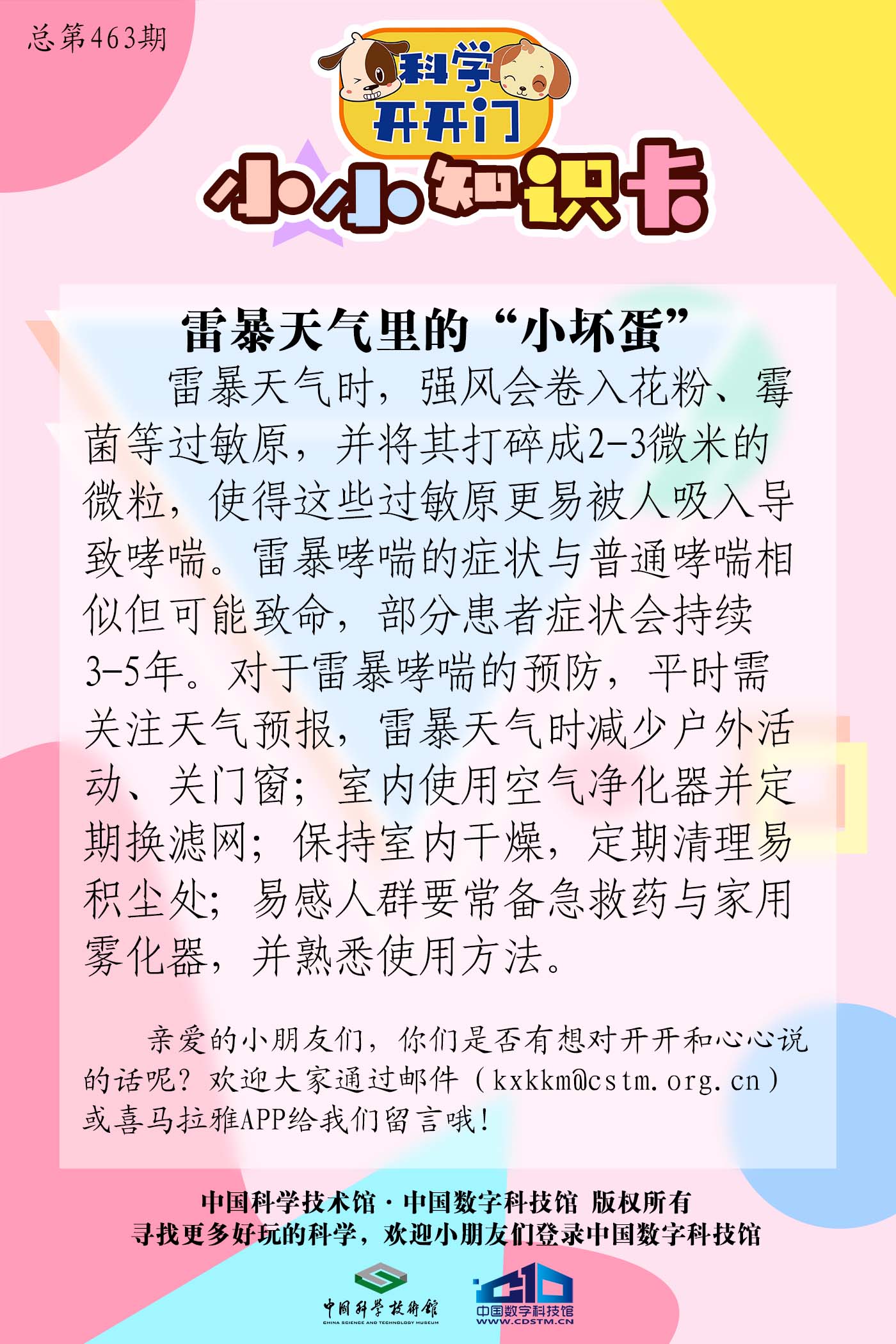 小朋友们,为什么有些人在雷暴天气后会出现剧烈的咳嗽和呼吸困难的症状呢?快来听听今天的节目寻找答案吧!